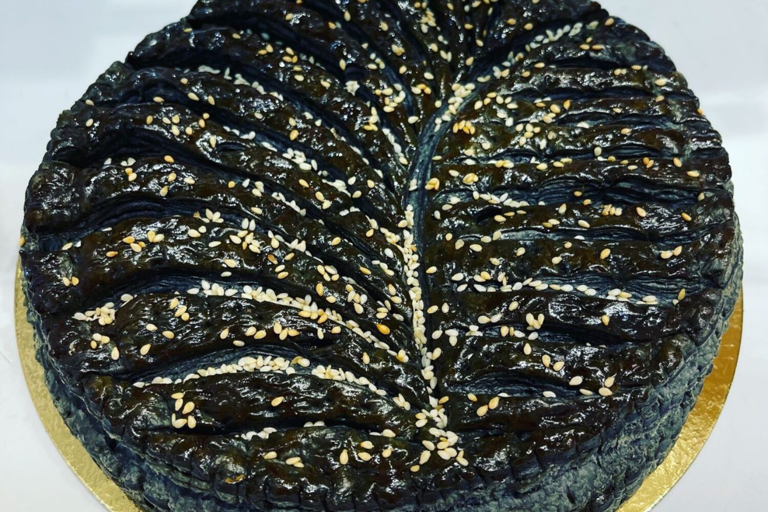 Découvrez notre nouveauté, la galette feuilletée au charbon actif, frangipane au sésame noir et graines de sésame blanc !